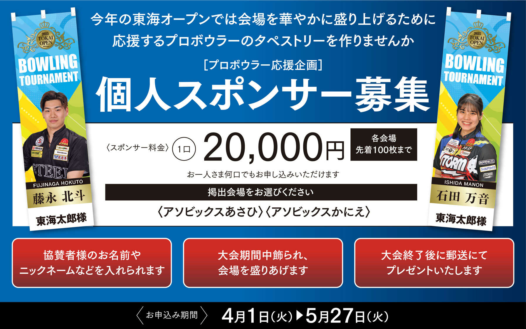 今年の東海オープンも、会場を華やかに飾るため応援するプロボウラーのタペストリーを制作します。 1口からでも応援できます。もちろん1人何口でもOKです。プロボウラーのタペストリーを作って応援しよう!! [スポンサー料]1口 20,000円(お一人様何口でもお申込みいただけます) [サイズ]タテ1500mm×ヨコ450mm [数量]各センタ-先着100枚まで 会場を選んでください。(あさひ・かにえ)